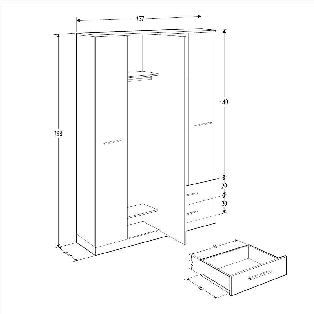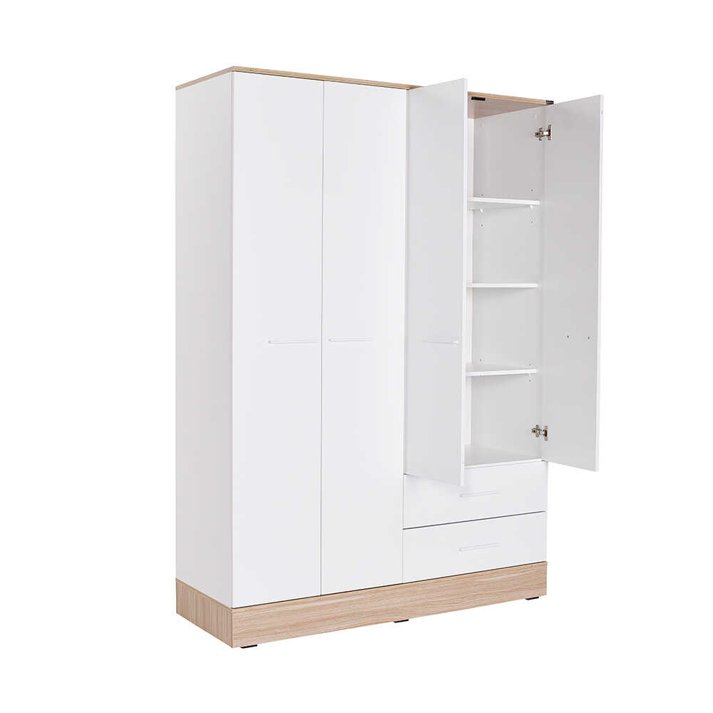 Η τετράφυλλη ντουλάπα , έχει ανοιγόμενα φύλλα και είναι κατασκευασμένη από μοριοσανίδα (νοβοπάν), ένα παράγωγο ξύλου από μικρά κομμάτια ξύλου και πριονίδι. Εξωτερικά έχει επένδυση μελαμίνης, η οποία προσφέρει ανθεκτικότητα στα γρατζουνίσματα, στην τριβή και στα διαβρωτικά. Διαθέτει ράβδο κρεμάσματος 2 συρτάρια και 5 ράφια, τα οποία παρέχουν τους απαραίτητους αποθηκευτικούς χώρους για ρούχα και λευκά είδη.