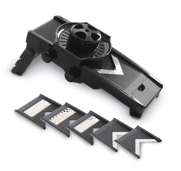 Από ανθεκτικό μαύρο PP και ABS. Περιλαμβάνονται 5 λεπίδες από ανοξείδωτο ατσάλι υψηλής ποιότητας. Βάση που διπλώνει με λαστιχένια πόδια. Κύρια λεπίδα κοπής σε σχήμα V. Λεπίδες για κοπή julienne ή για τηγανιτές πατάτες, πλάτους 6 ή 9mm. Ρυθμιζόμενο πάχος φέτας 1-9mm. Μεταλλικές καρφίδες που συγκρατούν το προϊόν. Ύψος: 140mm (με ανυψωμένο υποστήριγμα).