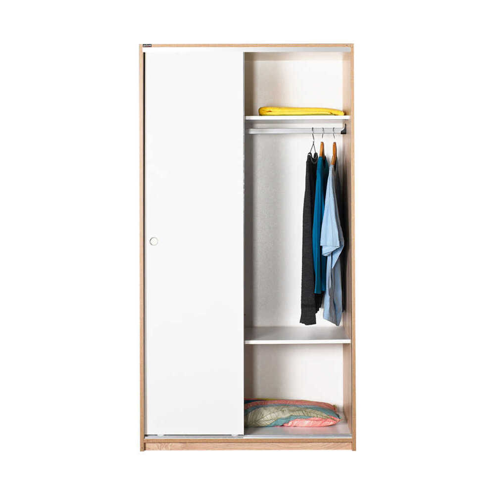 Η δίφυλλη ντουλάπα της εταιρείας ADORE έχει συρόμενα φύλλα είναι κατασκευασμένη από μοριοσανίδα (νοβοπάν), ένα παράγωγο ξύλου από μικρά κομμάτια ξύλου και πριονίδι. Εξωτερικά έχει επένδυση μελαμίνης, η οποία προσφέρει ανθεκτικότητα στα γρατζουνίσματα, στην τριβή και στα διαβρωτικά. Διαθέτει ράβδο κρεμάσματος και 5 ράφια, τα οποία παρέχουν τους απαραίτητους αποθηκευτικούς χώρους για ρούχα και λευκά είδη.