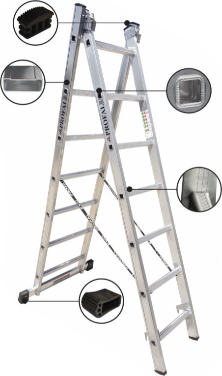 Διπλή σκάλα με 12 σκαλοπάτια της εταιρείας Profal ιδανική για οικιακή και επαγγελματική χρήση. Είναι κατασκευασμένη από αλουμίνιο, κάτι που την καθιστά ελαφριά έτσι ώστε να σας διευκολύνει κατά την μεταφορά της την ώρα της εργασίας.