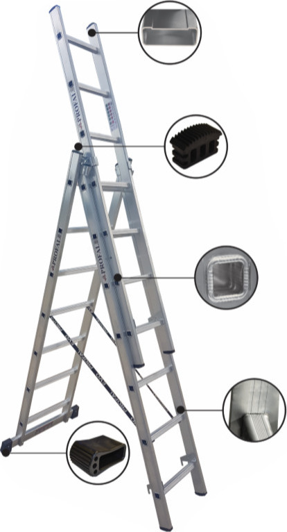 Τριπλή σκάλα με 7 σκαλοπάτια της εταιρείας Profal ιδανική για επαγγελματική χρήση. Είναι κατασκευασμένη από αλουμίνιο, κάτι που την καθιστά ελαφριά έτσι ώστε να σας διευκολύνει κατά την μεταφορά της την ώρα της εργασίας.